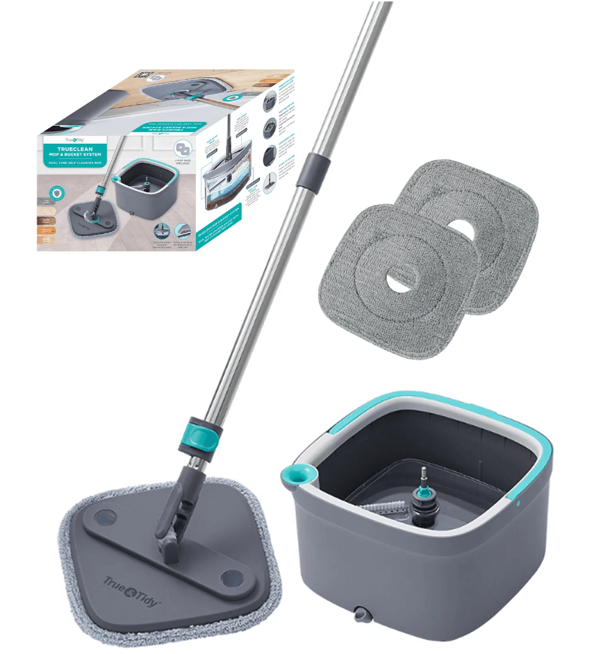 | 8 | True & Tidy TrueClean Spin Mop & Bucket System | Spin mop + built-in brush in the bucket to self-clean pad, separates clean vs. dirty water | Macy’s / Home Depot / Sam’s Club | ~$30 US |